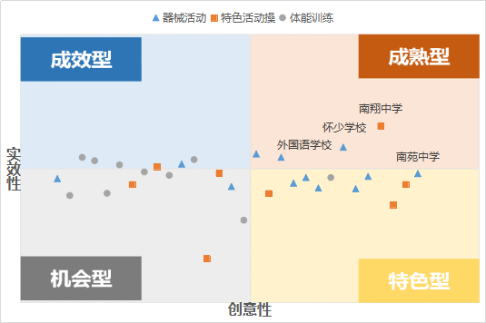 象限Ⅰ—成熟型:学校特色活动的实效性和创意性双高,活动有较好的运动效果且有着较好的设计,整体活动设计已经较为成熟,有着一定的推广价值;